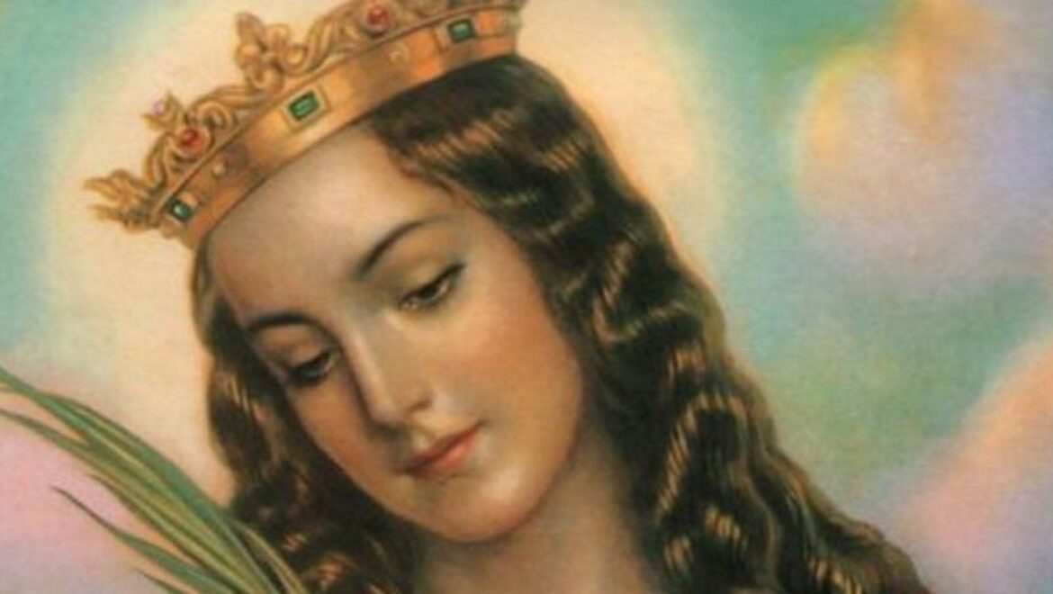 U sakralnoj umjetnosti prikazuje ju se kao plemkinju, okruženu ružama, s palmom u ruci i s kotačem načičkanim bodežima; ili se prikazuju njezine zaruke s Kristom i njezino polaganje u grob… Zaštitnica je djevojaka, teologa, studenata, učitelja i filozofa.