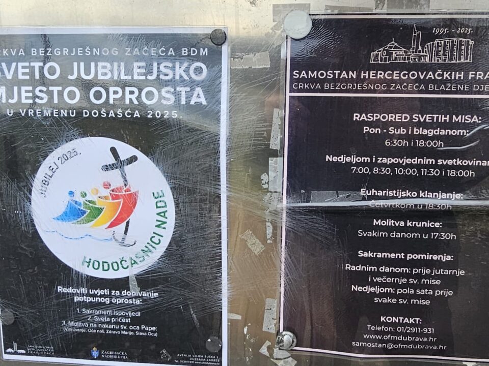 Nekoliko dana nakon što je papa Lav XIV. proglasio novu Jubilarnu godinu sv. Franje, u kojoj je moguće dobiti potpuni oprost, na ogradi crkve hercegovačkih franjevaca u zagrebačkoj Dubravi osvanuo je simpatičan duhovno-duhoviti grafit. “Oprosti mi… On ili ona možda neće, ali za 93m Bog hoće!, napisao je netko sprejem i nacrtao znak u plavom sa strelicom – potpuni oprost 93m ➡️. Odnosno, da se za niti manje od stotinu metara od toga mjesta nalazi ulaz u crkvu Bezgrešnog začeća Blažene Djevice Marije, u kojoj se, kao i diljem franjevačkih crkava u Hrvatskoj i svijetu, može dobiti potpuni oprost od 10. siječnja ove godine do 10. siječnja 2027.
