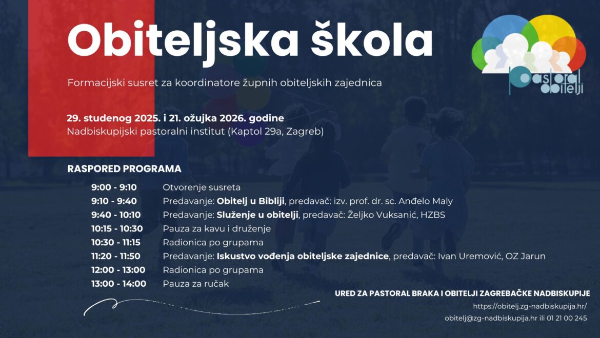 U subotu, 29. studenog 2025., u 9 sati u Nadbiskupijskom pastoralnom institutu na Kaptol 29a u Zagrebu, održat će se “Obiteljska škola – formacijski susret za voditelje obiteljskih zajednica”. Tom prigodom okupit ćemo nešto više od pedeset obiteljskih zajednica Zagrebačke nadbiskupije, koje očekuje niz zanimljivih predavanja i dvije praktične radionice gdje će zajednički i konstruktivno promišljati o obiteljskom pastoralu.